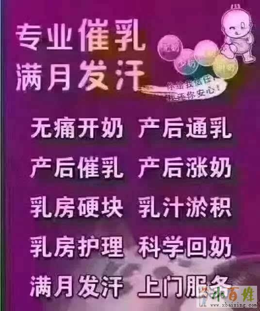 服务内容:产后开奶、 涨奶、 奶少, 奶水淤积严重形成的肿块, 乳腺堵塞导致的急慢性乳腺炎, 乳头凹陷皲裂所致喂奶困难, 回奶。www.xbaixing.com小百姓网